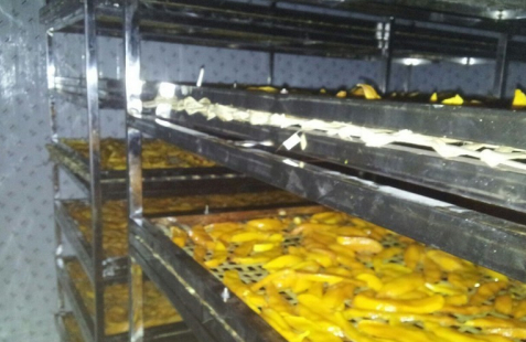 去皮切片:外皮必須去凈,因果皮中含有較多的單寧,如未削凈,在加工過程中容易產(chǎn)生褐變,影響成品色澤。去皮后的果實(shí)用鋒利刀片縱向切片,厚度約為8~10mm。芒果片護(hù)色期間添加白砂糖,一層芒果片一層砂糖,上面還要覆蓋一層砂糖。砂糖腌制時(shí)間不能太長,一般為8小時(shí),過后抽出糖水,把糖水入鍋濃縮,再將果塊倒入糖水中,如果砂糖不夠還可以補(bǔ)加,使糖水濃度達(dá)到45%~60%。注意芒果片不能直接煮制。浸泡糖液初始溫度30左右為宜。浸漬過程的添加成份均要求符合食品衛(wèi)生標(biāo)準(zhǔn)。將芒果片小心取出,瀝干水分后,均勻的擺在烘干托盤上,之后放入烘干房里干燥。一段:時(shí)間4H,溫度45,濕度控制在65%。二段:時(shí)間6H,溫度55,濕度控制在42%。第三段:時(shí)間2H,溫度62,濕度控制在26%。時(shí)間運(yùn)行結(jié)束即可保證芒果干烘干完畢。