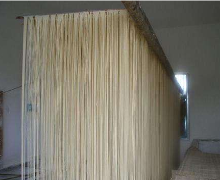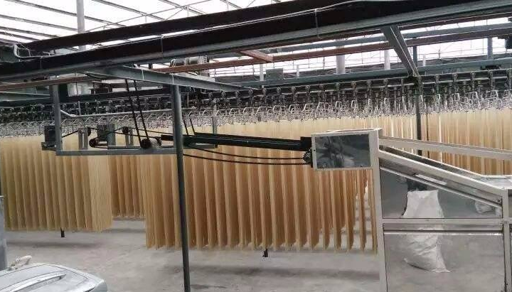 自然干燥就是在風(fēng)和日暖(氣溫不低于20℃)相對濕度 60%一 80%的地區(qū)或季節(jié),將濕面條掛在掛桿上,自然風(fēng)干。由于烘干時間長,因此產(chǎn)品質(zhì)量好且不易出現(xiàn)酥面。我國民間多用此法。烘房干燥可分為固定式與移行式兩種,前者掛桿固定,將面條掛在掛桿上后送入烘房,經(jīng)熱空氣吹干,屬間歇式生產(chǎn)。移行式烘干是一種連續(xù)烘干方式,在一隧道式烘房中進(jìn)行,干燥裝置由鼓風(fēng)機(jī)、散熱器、熱風(fēng)管道、擴(kuò)散風(fēng)扇用濕機(jī)等組成,移行裝置由機(jī)架、鏈條、鏈輪、傳動軸、電動機(jī)等組成,面條掛在冊上進(jìn)入烘房,在烘房中緩緩移行,達(dá)到干燥要求。